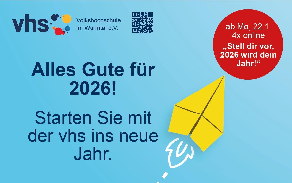 Ob Sie sanft abheben oder gleich voll durchstarten: Wir freuen uns, wenn Sie 2026 mit uns lernen, diskutieren, gestalten und ausprobieren. Über die Homepage der Volkshochschule können Sie sich jederzeit anmelden. Die Geschäftsstelle ist ab Mittwoch, 7.1. wieder geöffnet, wir freuen uns auf Sie!